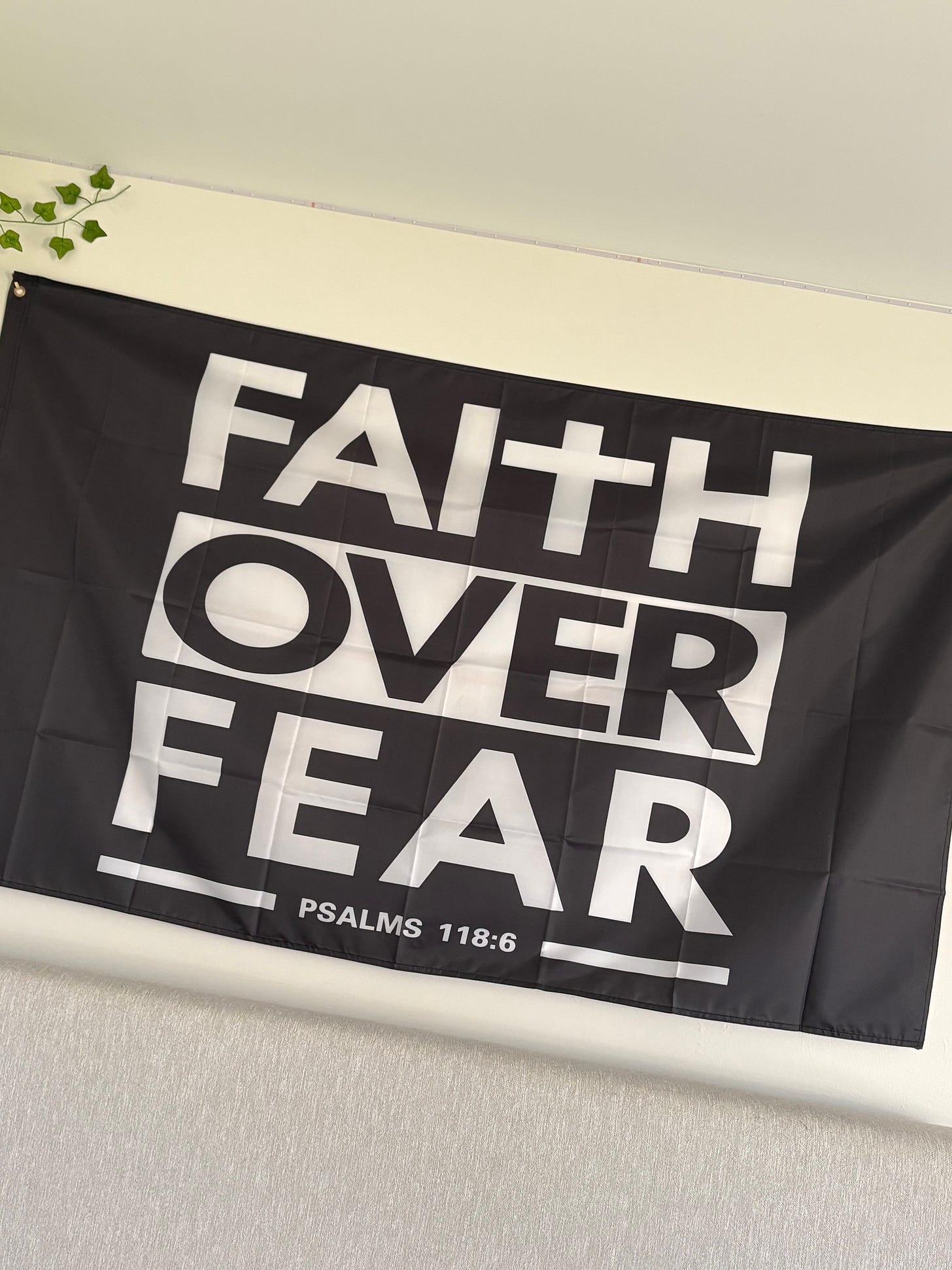 Above my daughter’s bed hangs a very large cloth sign that reads “Faith Over Fear” in black and white. It’s hard to miss. It’s very large.